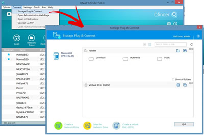 Windows version of Qfinder Pro provides a convenient way to connect to the Turbo NAS and map a network drive or a virtual disk. By creating a shared folder on the Turbo NAS and mapping it as a network drive, you can use it as an additional drive and store files on it as it is a local drive of the computer.