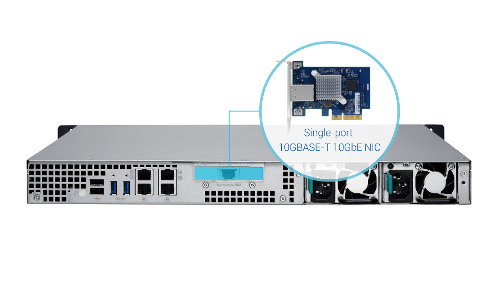 | 10 Gigabit Ethernet Port | 1 x RJ45 10GBASE-T via a pre-installed PCIe network card, supporting 10G/5G/2.5G/1G/100M speeds Note: Please use Cat 6a or Cat 7 LAN cables to achieve 10GbE speed over longer distance (not included). |