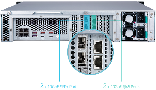 The TS-h1283XU-RP provides four Gigabit RJ45 ports, and also supports 10GbE connectivity with a pre-installed dual-port 10GbE RJ45 expansion card and a dual-port 10GbE SFP+ expansion card to satisfy bandwidth-demanding applications, including virtualization, large file sharing, and high-speed backup and recovery.